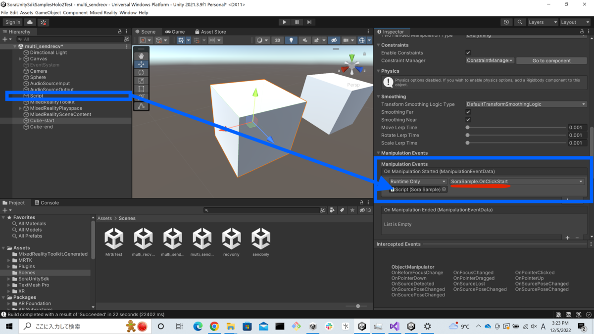 ObjectManipulatorを設定しているものを使用します。これをコピーして、それぞれ名前をCube-start,Cube-endにします。(名前は好きに変えてOKです) それぞれ、Manipulation EventsでHierachyのScriptをドラッグ&ドロップし、アクション内容をSoraSample.OnClickStart, SoraSample.OnClickEndにします。 これで、HoloLens2上でアプリを実行した際に、目の前に表示されるObjectを掴むと通信開始・終了が制御出来るようになります。