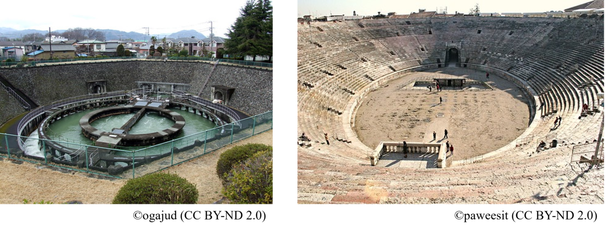 ちなみに、左が相模原市にある「下九沢分水池」というスポット、右が有名スポットであるイタリアのコロッセオの組み合わせです。 似た例だと、埼玉県の首都圏外郭放水路がエジプトのカルナック神殿に似ているとして話題になっているので、これも大袈裟に言うと「相模原のコロッセオ」と言えるかもしれません。 観光資源としてどうなのか?という点は一旦置いておくとして、ちょっとした地域の話題作りとか、映画やアニメのロケ地とか、写真を撮ったり、等々には面白いかもしれません。(実際に立ち入れるか等は保証できかねますが。)