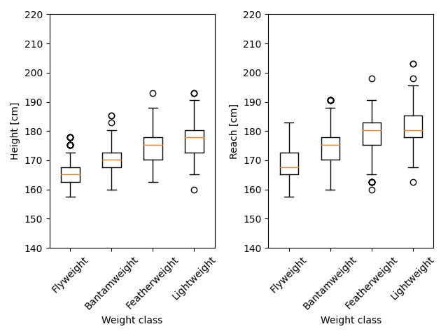 import matplotlib.pyplot as plt weight_classes = ['Flyweight', 'Bantamweight', 'Featherweight', 'Lightweight'] height_s = [df[df['weight_class'] == cls]['B_Height_cms'] for cls in weight_classes] reach_s = [df[df['weight_class'] == cls]['B_Reach_cms'] for cls in weight_classes] fig = plt.figure() ax1 = fig.add_subplot(1, 2, 1) ax1.boxplot([height_s[0].dropna(), height_s[1].dropna(), height_s[2].dropna(), height_s[3].dropna()], labels=['Flyweight', 'Bantamweight', 'Featherweight', 'Lightweight']) ax1.set_xlabel('Weight class') ax1.set_ylabel('Height [cm]') ax1.set_ylim(140, 220) plt.xticks(rotation=45) ax2 = fig.add_subplot(1, 2, 2) ax2.boxplot([reach_s[0].dropna(), reach_s[1].dropna(), reach_s[2].dropna(), reach_s[3].dropna()], labels=['Flyweight', 'Bantamweight', 'Featherweight', 'Lightweight']) ax2.set_xlabel('Weight class') ax2.set_ylabel('Reach [cm]') ax2.set_ylim(140, 220) plt.xticks(rotation=45) plt.tight_layout() plt.show()
