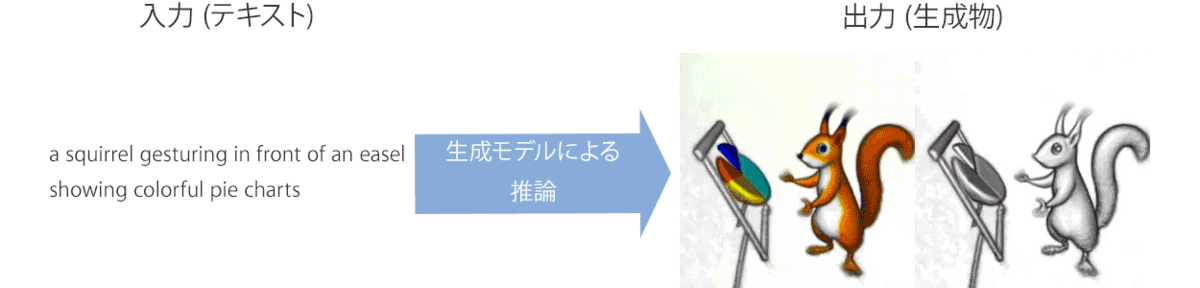 本記事の「テキストや単体画像からの3D生成」とはそのままの意味で、単体画像やテキストを入力として、入力内容に基づいて3D表現を出力する手法を指します。 例えば、テキストから3D生成を行う手法の一種であるDreamFusion[1]では、以下の図の様に「a squirrel gesturing in front of an easel showing colorful pie charts」(カラフルな円グラフを示す画架の正面で身振りするリス)というテキストをモデルに入力すると、このテキスト内容に従った3D表現を出力することができます。