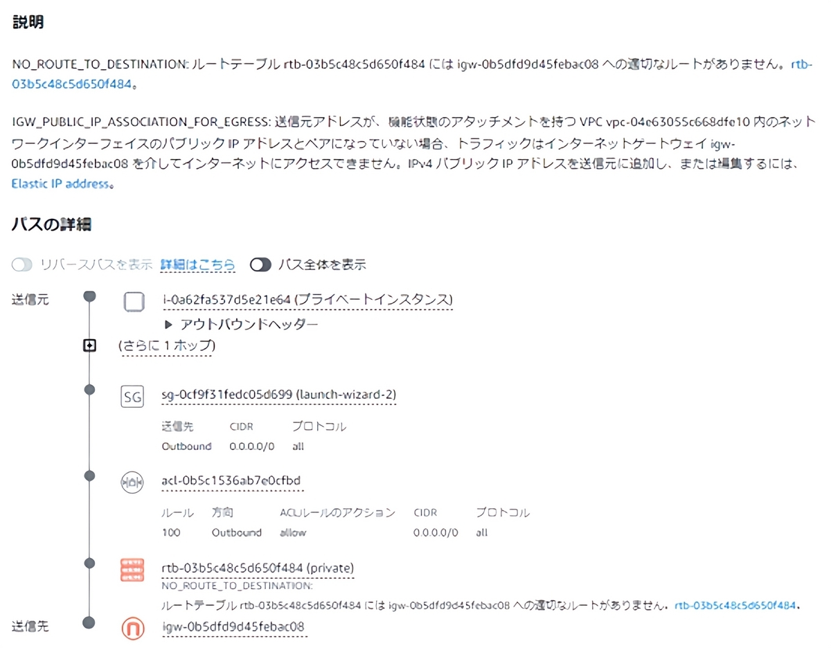 パスの詳細を分析し、インターネットゲートウェイへのルートがないことを発見してくれました。