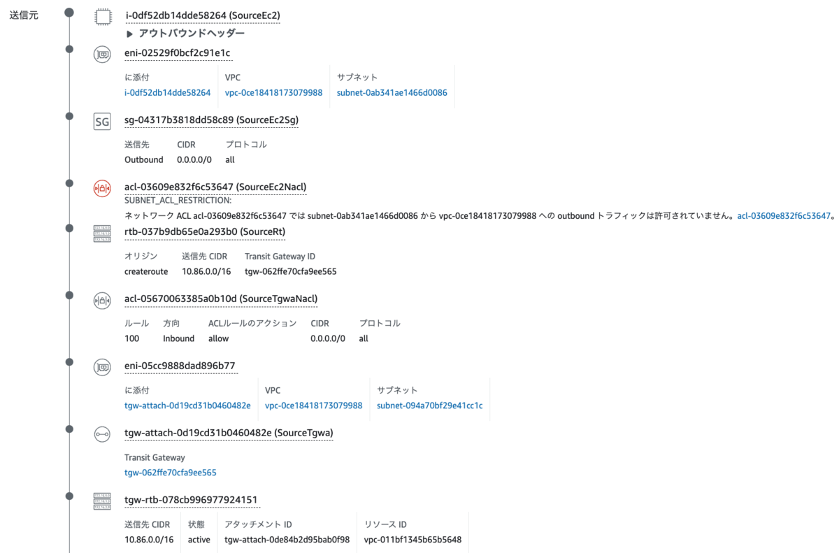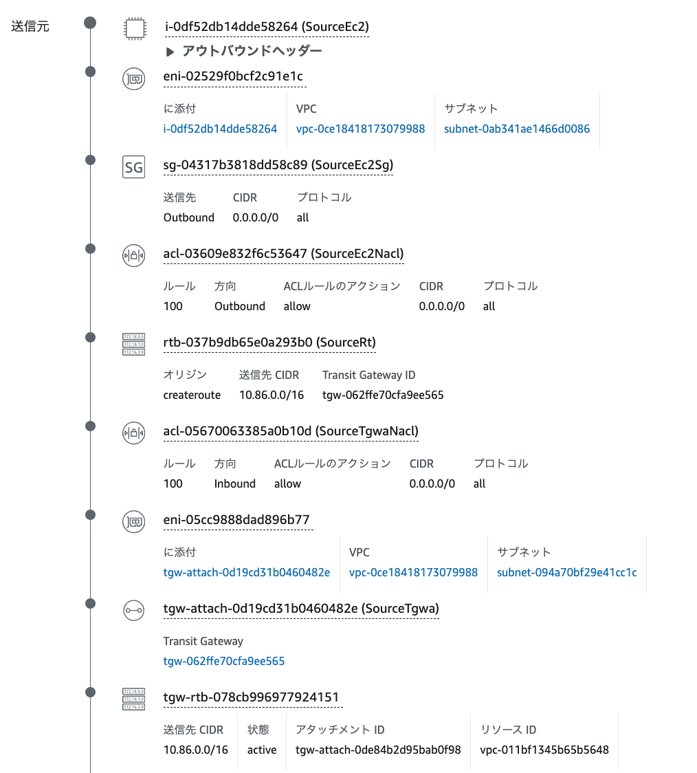 Reachability Analyzerの結果から分かるように、SourceEc2から通信が始まり、SourceEc2Sgのアウトバウンド → SoueceEc2Naclのアウトバウンド → SourceTgwaNaclのインバウンドの評価を受けてTransit Gatewayに辿り着いていることがわかります。つまり、SourceTgwaNaclのアウトバウンドの評価は受けていないこということです。