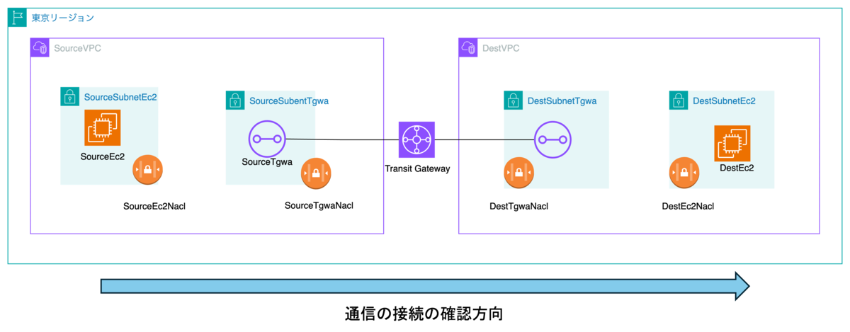 今回のTransit Gatewayを利用してVPC間の通信を以下のような構成を使って実験しようと思います。左側のVPCをSourceVPC、右側のVPCをDestVPCとして、それぞれのVPCにプライベートサブネットを二つ作成します。