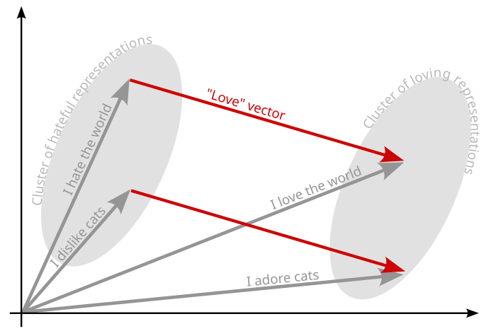 線形表現仮説(The Linear Representation Hypothesis) [5] に基づいて説明されることがあります。この仮説では人間が解釈できる高レベルの概念の多くが、言語モデルのアクティベーション出力として線形に表現されることを提唱しています [6]。